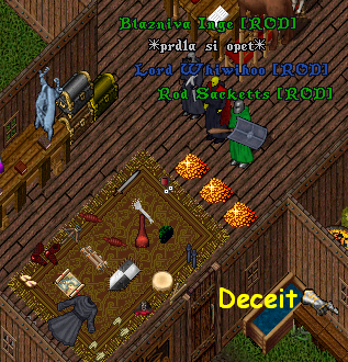 Jaksi souhra kliknutí na dveře a \"wordl save has been initated\" byla tak ?ikovná, ?e sme si u bloodu prohlídli akorát vstupní dveře. Tak hurá do Deceitu. V?echno tam lehlo a my sme si odnesli: 100k, Moonstone, mapu LVL3, cobwebby string, fortif.stit,3 roby +10 a vic,2 mystik casti, kosti, srdce, elixir. Prostě fajn. Pečlivý mýtiči: Rod Sacketts(ROD), Blazniva Inge(ROD) a ?adatelé Ludmila a Empti.