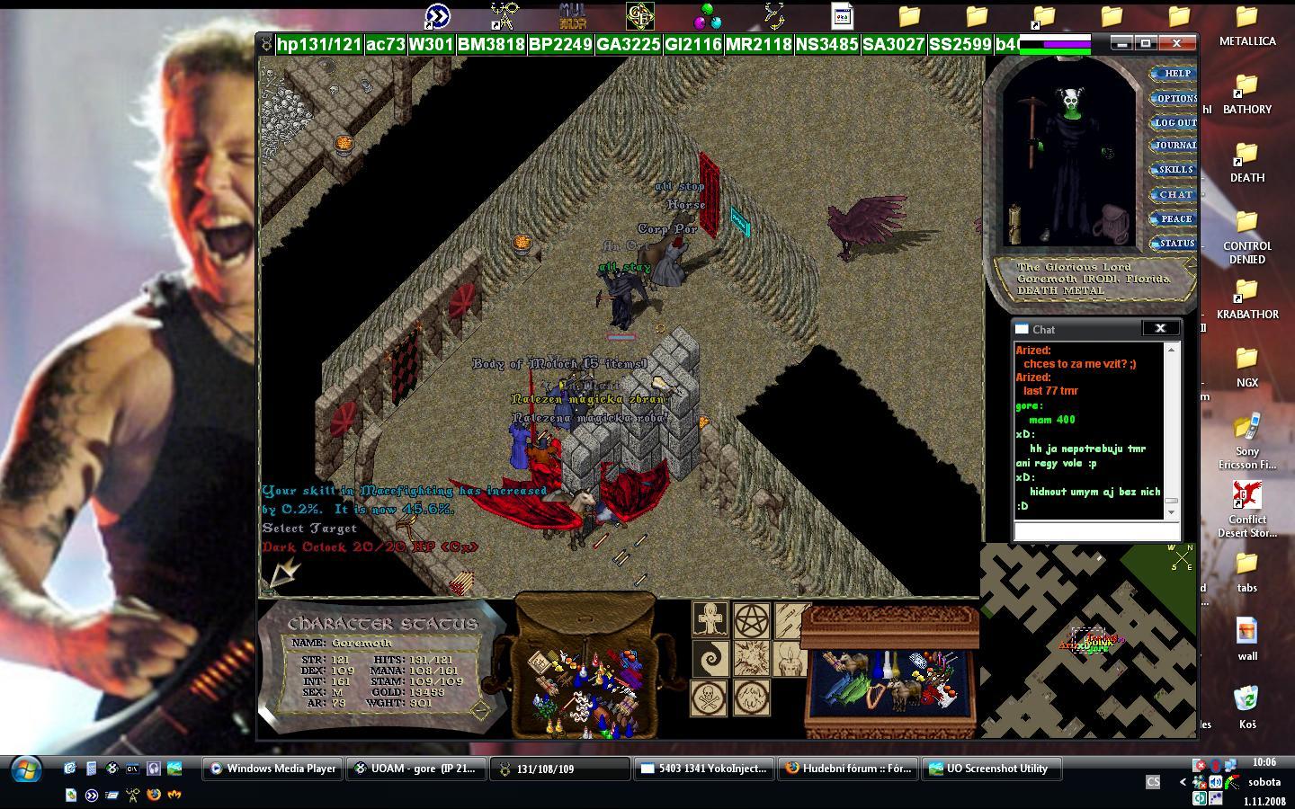 Tak prvni listopadovej den jsme se vydali opet po delsi dobe do rise. Sestava se sesla fakt kuriozni jaka se moc casto nevidi. Haldir, Tomkad, Ja, Bob, Whi, Ari, Vancis a externista Ponda - to hovori za vse, hlavne ten zacatek. Probihalo to na pohodu, se vsim jsme se hrave poradili, az na maly zdrzeni u blacka kdyz jsme museli sundat wyrma pres ohradu. Tak sme si dosli v klidu a miru az k molochum, kde to obcas bylo hustejsi, ale zadnej extrem. Tam jsme to i zakoncili, protoze lidi museli koncit, ale i presto cca 11-12 ulovenejch kousku hovori za vse. K lootu asi tolik: +9 WM, +25 deathka, black must, par +9itek, +20 roby, sperky, knizky, blood coifa. Takze dik za akci!