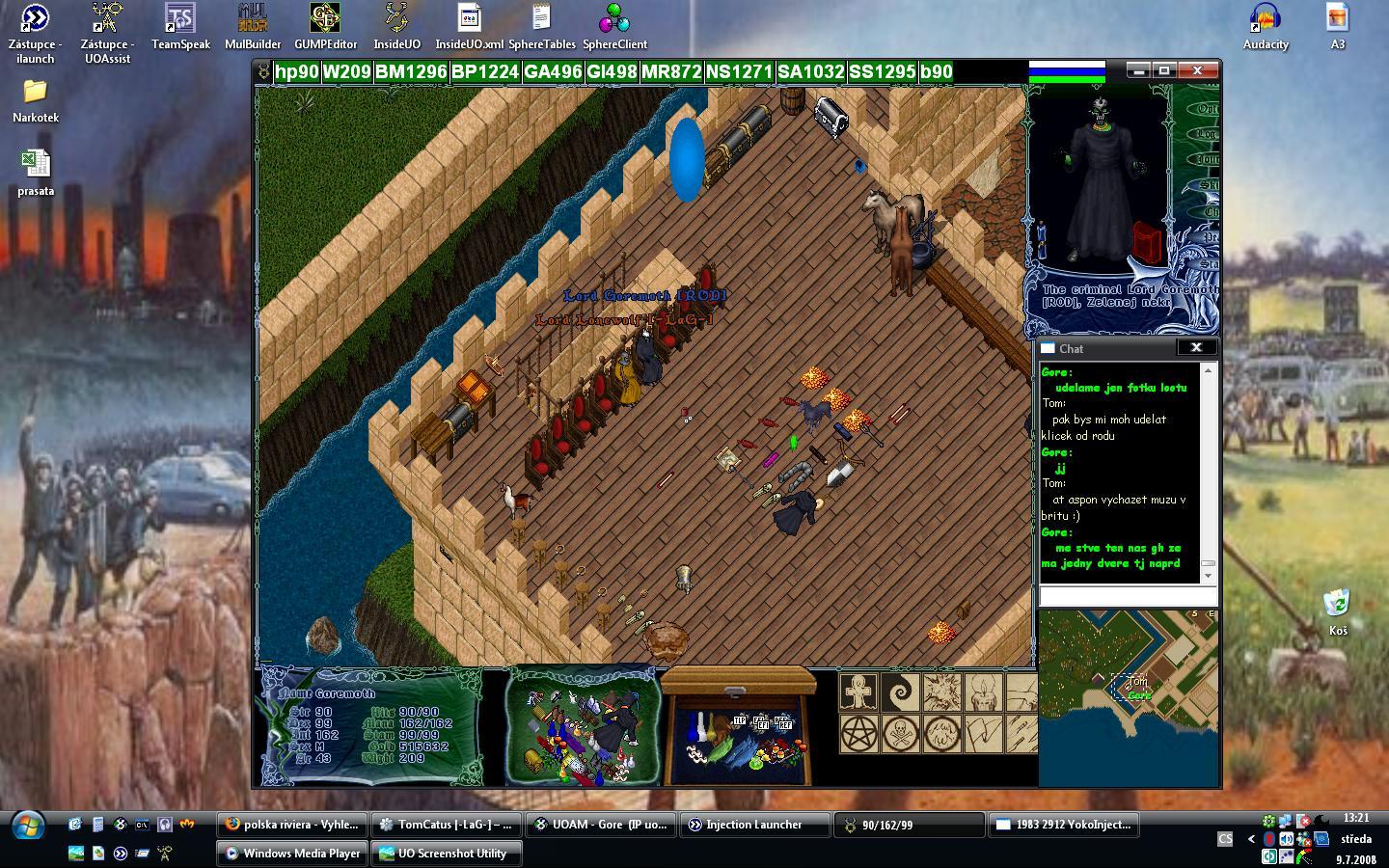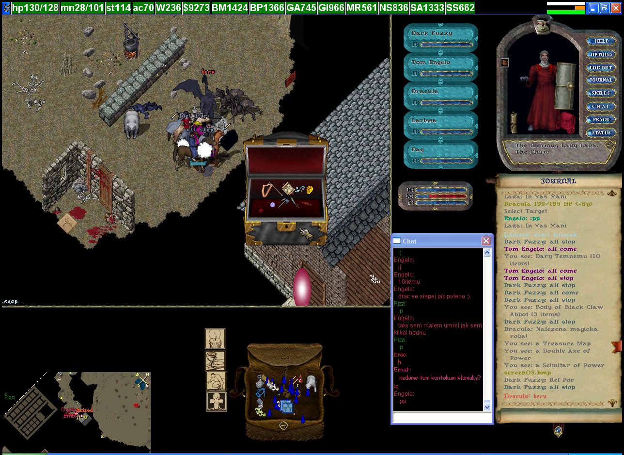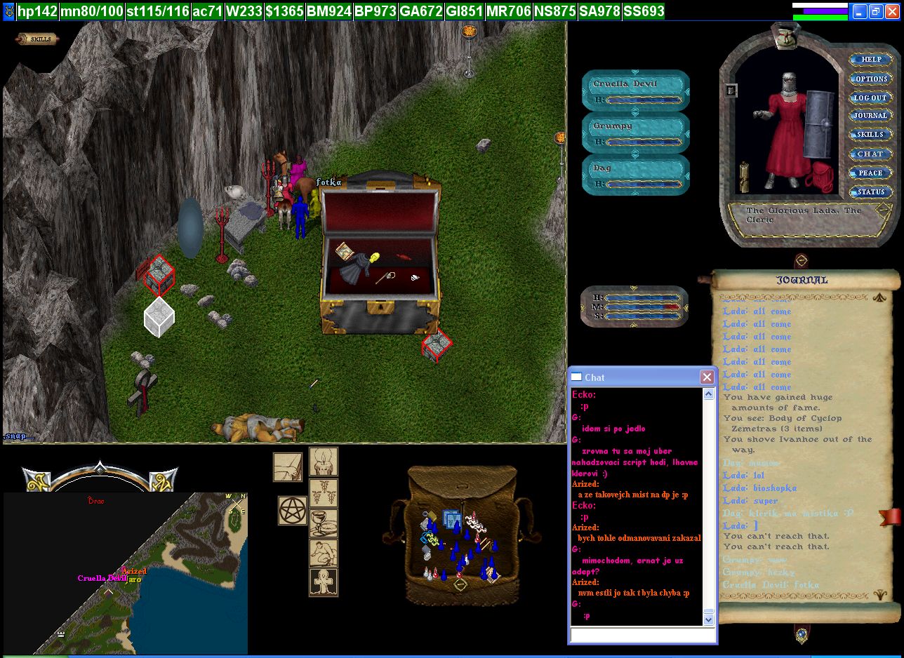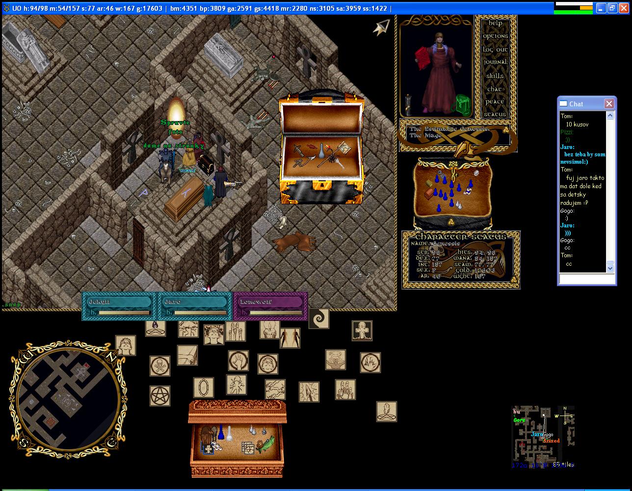 Vydali sme se s tomem jako dva mighty mage na harv vseho co se dalo. Vse probihalo celkem dobre akorat ten drop stal za hov... pobihali sme celou noc po svete a zabijeli fenixe, spider nigthmary, wyrmi, elder demony, a dalsi ruzne prisery. Loot : +7 hala, +20 chain tunica, blood ringmail coif a naky smeti.