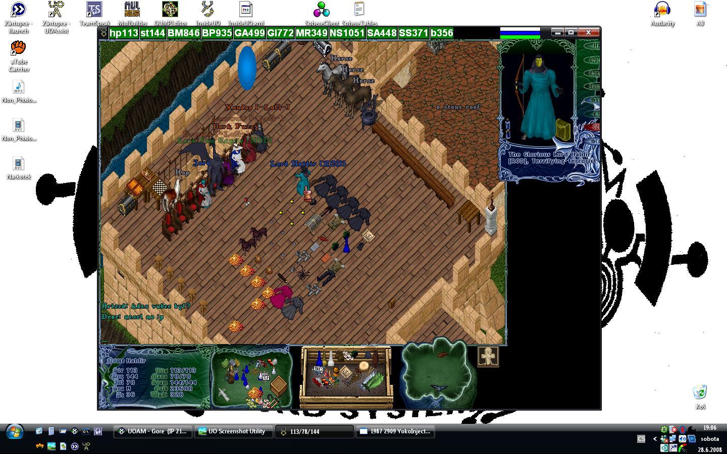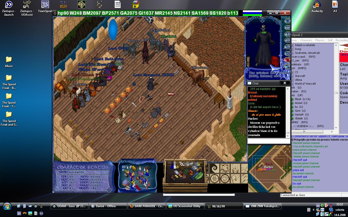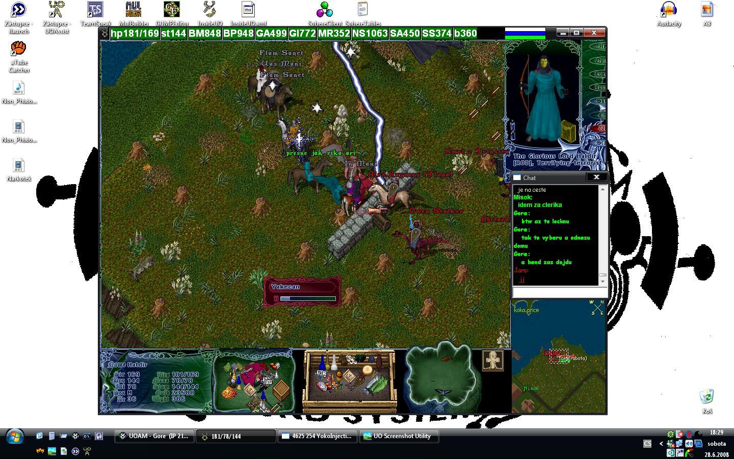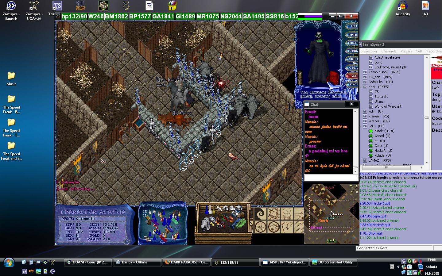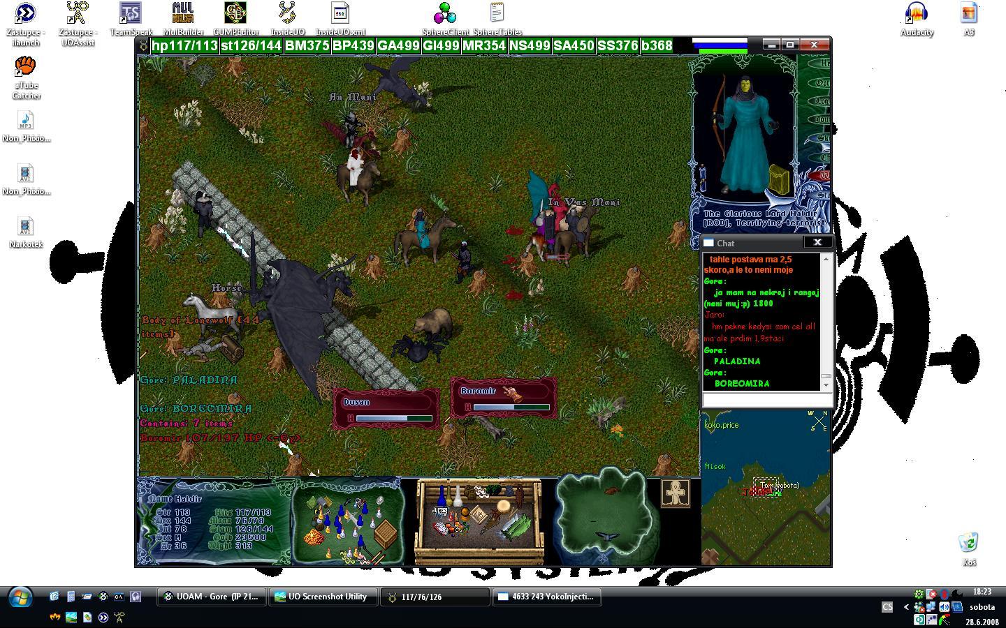 Tak jsme se po obede regroupli a vyrazili do FDD. Vsechno slo pekne a svizne, az na par zavahani a trochu chaos v posledni mistnosti :) Z lootu mimojine padla lvl 5 mapa ke ktery se odviji dalsi povidani. Vratili jsme se domu a rozhodli mapku rovnou zajit, nachazela se v Moonglow kousek za GZ. Cestou jsme bezeli i kolem domku s cislem !!!116!!! cimz jim timto dekujem za jejich BONZ (relog?) protoze prave oni na nas poslali/relogli pk. Nic naplat, prvni varku dvou pk sme se smichem odrazili a mapkovali dal, potom se na nas vsak vrhla hotova smrst vrahounu, teda spis parodie na ne. Mapku sme si vybrali a rozutekli se domu. Prereffli jsme a v nejlepsi chvili se vratili zpatky a vetsinu pk jsme si solidne polozili, takze ekvip naseho maga Preslyho mame zpet a to se pocita! Nutno uznat ze to byl slusnej chaos, ale bitva pekna a rychla. Prikladam par fotek a vsem zucastnenym - ROD: Gore, Tom Engelo, cekatel Jaro, LaG: Ari, Tom(Catus), Xon (za nej sel pak Ari) a Dracula - dekuju za zachovani klidny hlavy a za peknej dung.