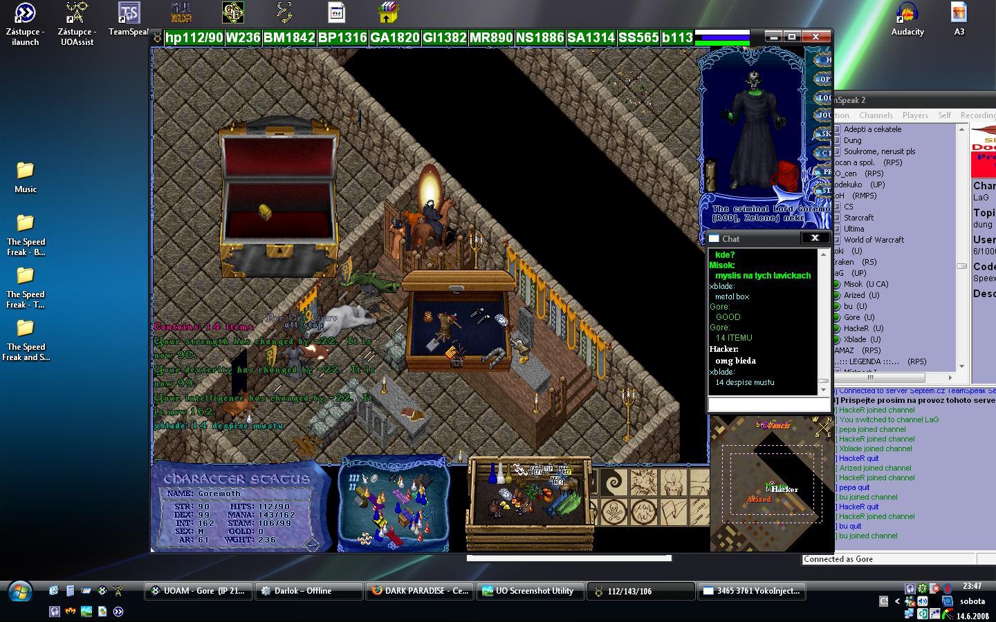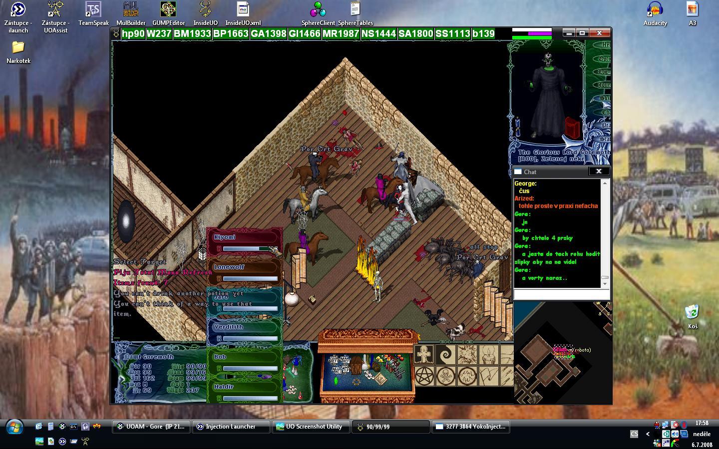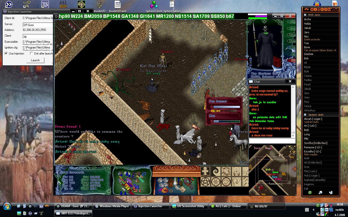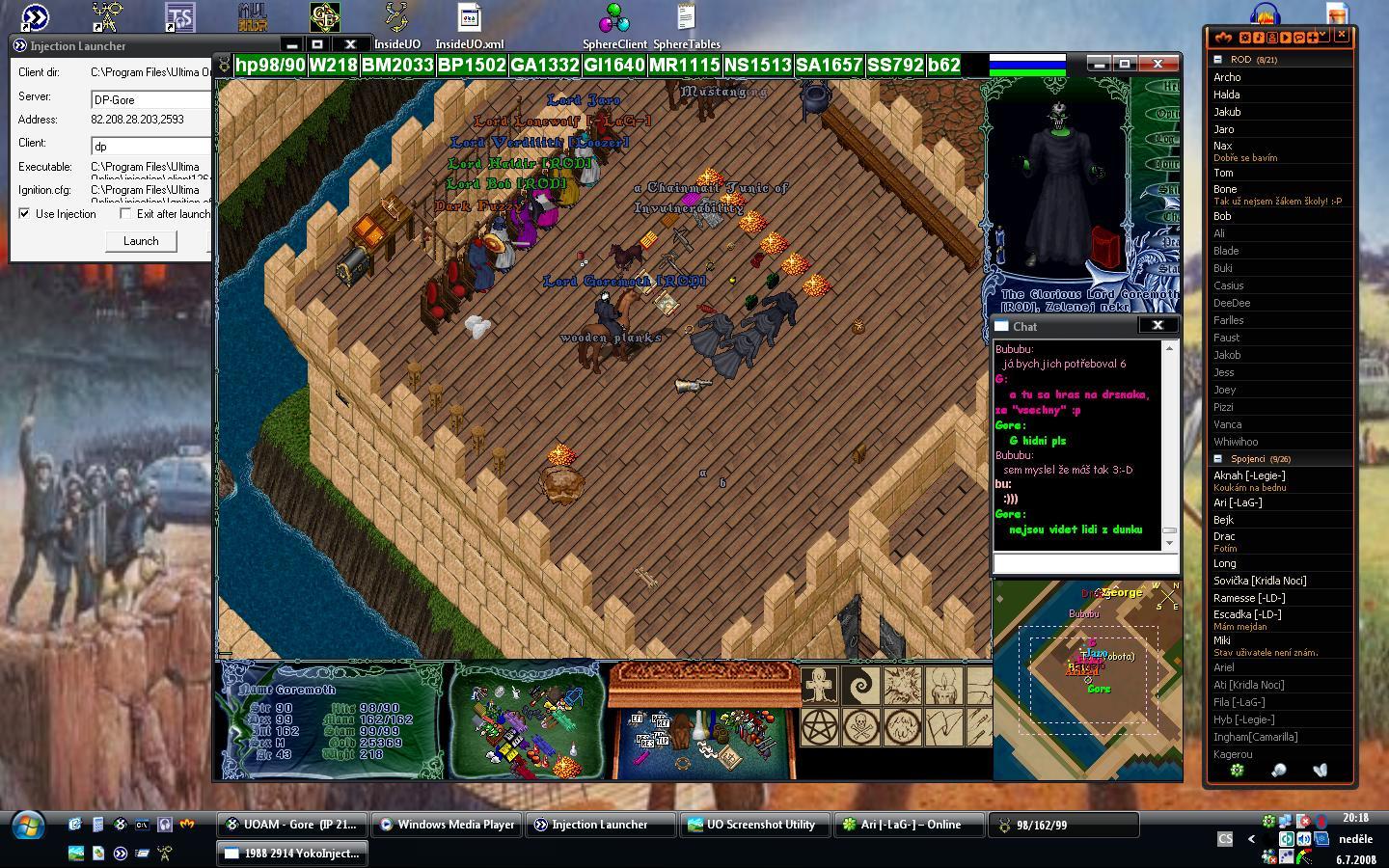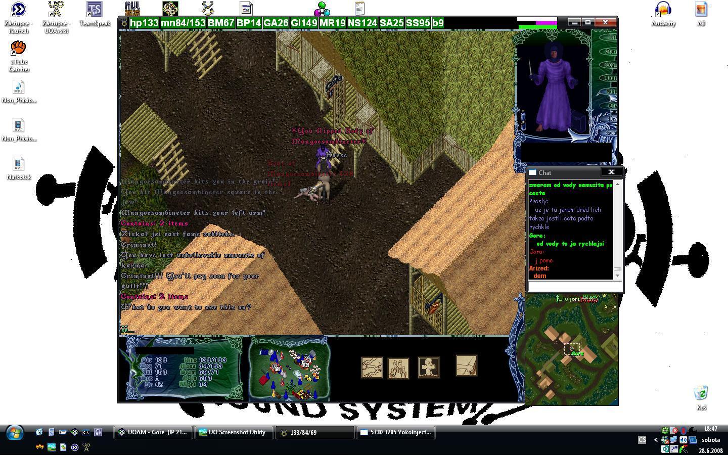 Tak jsme se po obede regroupli a vyrazili do FDD. Vsechno slo pekne a svizne, az na par zavahani a trochu chaos v posledni mistnosti :) Z lootu mimojine padla lvl 5 mapa ke ktery se odviji dalsi povidani. Vratili jsme se domu a rozhodli mapku rovnou zajit, nachazela se v Moonglow kousek za GZ. Cestou jsme bezeli i kolem domku s cislem !!!116!!! cimz jim timto dekujem za jejich BONZ (relog?) protoze prave oni na nas poslali/relogli pk. Nic naplat, prvni varku dvou pk sme se smichem odrazili a mapkovali dal, potom se na nas vsak vrhla hotova smrst vrahounu, teda spis parodie na ne. Mapku sme si vybrali a rozutekli se domu. Prereffli jsme a v nejlepsi chvili se vratili zpatky a vetsinu pk jsme si solidne polozili, takze ekvip naseho maga Preslyho mame zpet a to se pocita! Nutno uznat ze to byl slusnej chaos, ale bitva pekna a rychla. Prikladam par fotek a vsem zucastnenym - ROD: Gore, Tom Engelo, cekatel Jaro, LaG: Ari, Tom(Catus), Xon (za nej sel pak Ari) a Dracula - dekuju za zachovani klidny hlavy a za peknej dung.